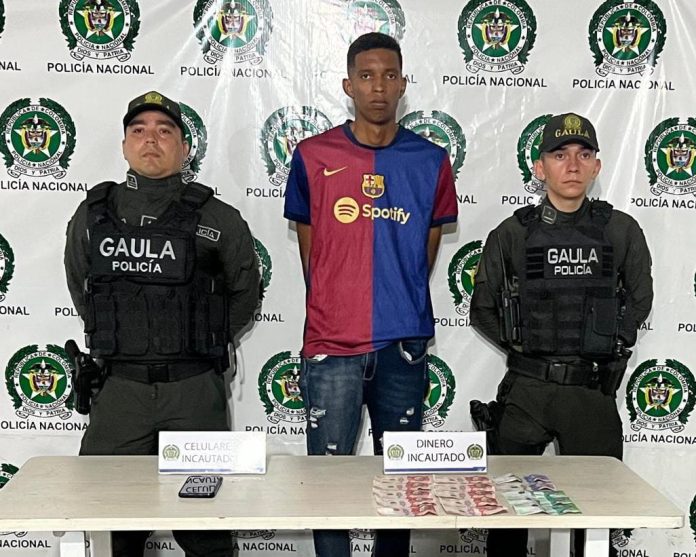 En un operativo desarrollado en el barrio Las Palmas, la Policía capturó a un hombre conocido con el alias de “El Negro”, señalado de presuntamente distribuir panfletos extorsivos en diferentes establecimientos comerciales de los barrios El Campito, Las Palmas y La Magdalena.