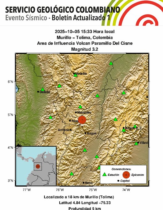 #SismosColombiaSGC Evento Sísmico – Boletín Actualizado 1, 2025-10-05, 15:33 hora local Magnitud 3.2, Profundidad 5 km, Murillo – Tolima, Colombia – Area de Influencia … ¿Sintió este sismo? repórtelo https://t.co/pgC7OC2O7j https://t.co/63pt8nVsSe #Temblor #Sismo pic.twitter.com/v7nf2hDQM7