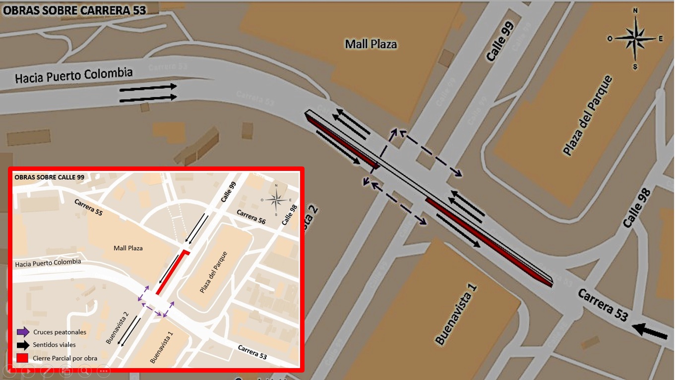 • Tramo intervenido: la calzada occidental de la calle 99, entre carreras 55 y 53. - Cierre parcial en la carrera 53