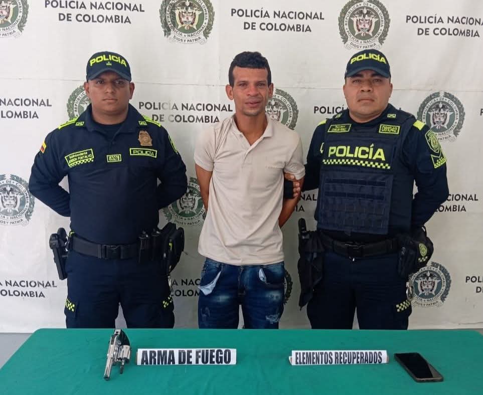 Durante el registro, los policías le encontraron un arma de fuego y un celular, reconocido posteriormente por la víctima como de su propiedad. El individuo fue trasladado a la URI de Soledad, quedando a disposición de la autoridad competente.