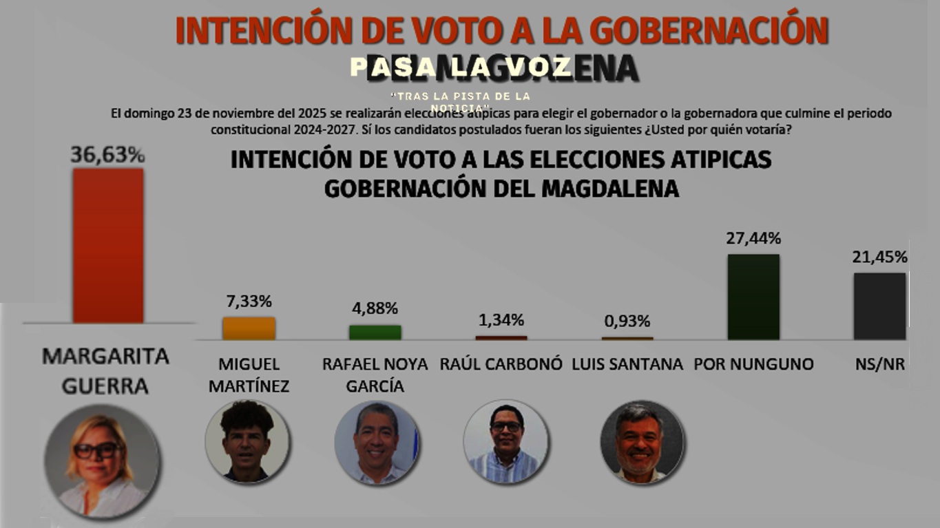 A menos de un mes de las elecciones atípicas para la Gobernación del Magdalena, la candidata Margarita Guerra se consolida como la favorita entre los votantes, de acuerdo con la más reciente encuesta presencial realizada por la firma Mediciones Estratégicas S.A.S., inscrita ante el CNE bajo la resolución 02052 del 6 de mayo de 2025.