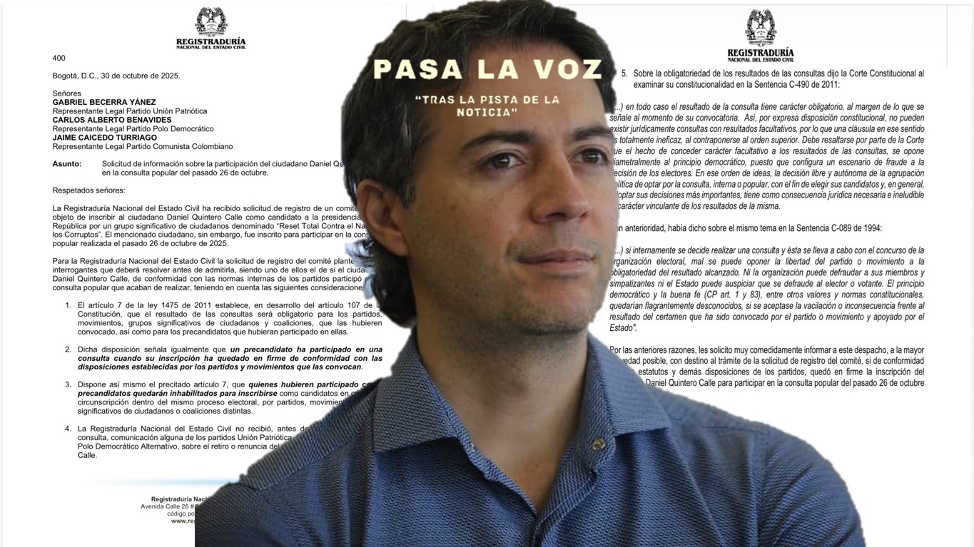 La Registraduría Nacional del Estado Civil abrió un nuevo capítulo en la ya polémica carrera presidencial de Daniel Quintero Calle, al solicitar formalmente a los partidos Unión Patriótica, Polo Democrático y Comunista Colombiano que certifiquen si el exalcalde de Medellín participó o no en la consulta popular del Pacto Histórico, realizada el pasado 26 de octubre.